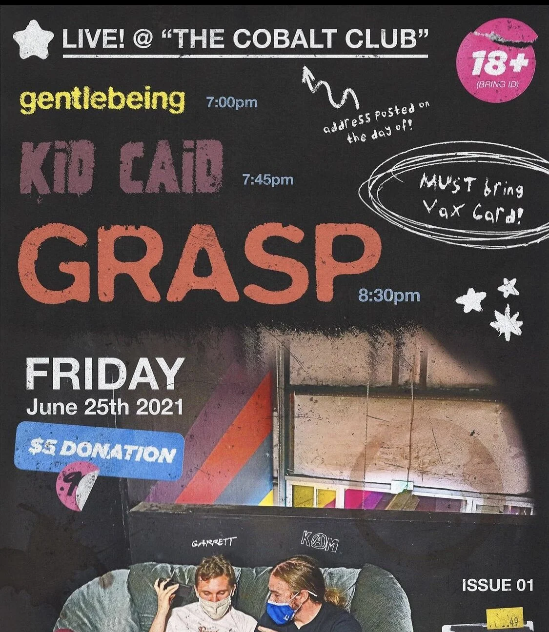 Eugene bands Grasp, Gentlebeing, and Kid Caid will be holding a vaccinated live event on the 25th of June. Live shows are slowly returning with the vaccine distributed. It is a five dollar entry with your vaccination card. Expect more live shows to start in Eugene, and everywhere else.